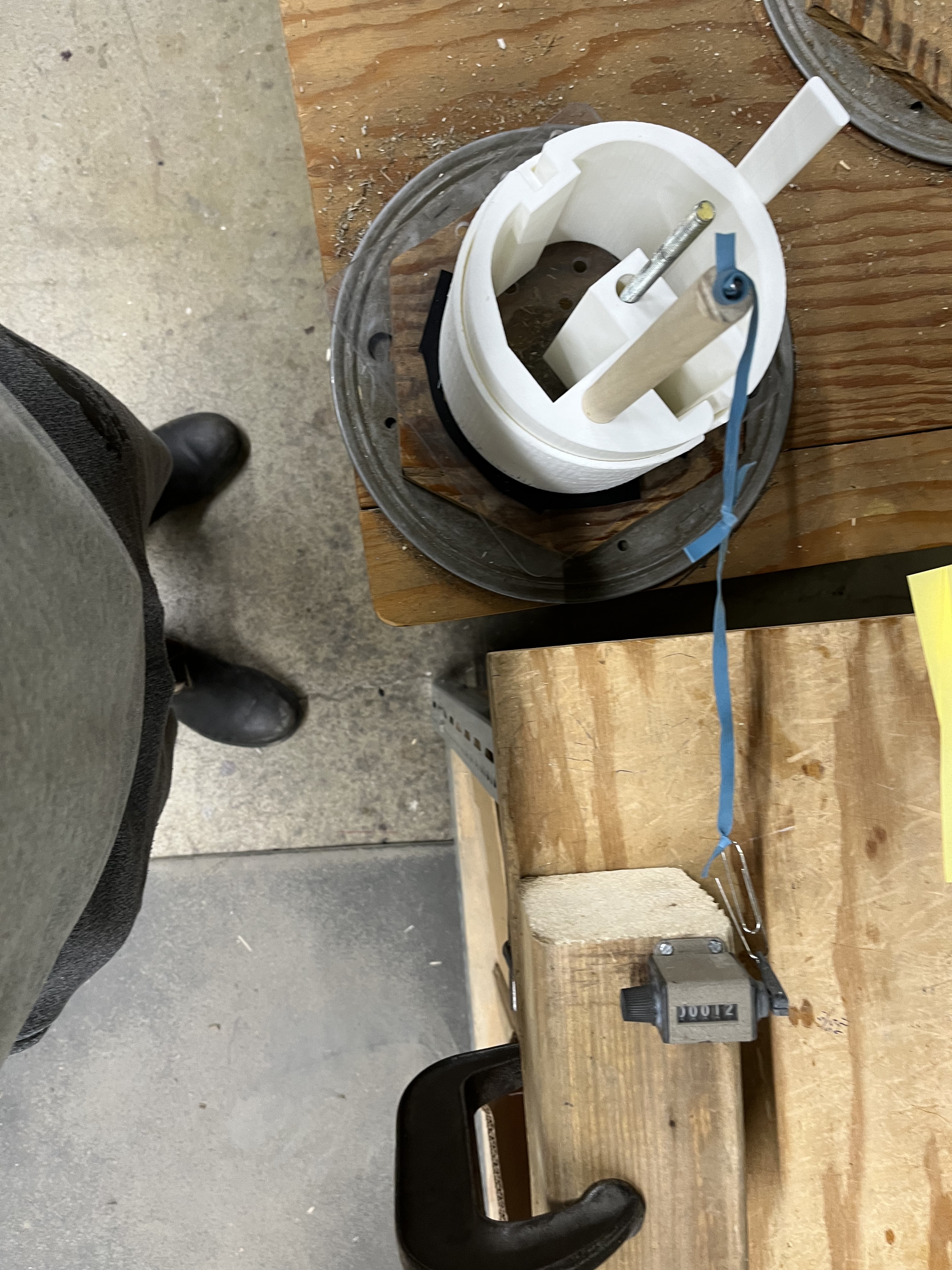 In the initial design, I 3D-printed a cylindrical device with a sliding shell. The wire was wound by spinning the cylinder on a turntable connected to the spool. Once wrapped, the sliding shell was removed to release the coiled wire, which was secured with a zip tie. However, this version had flaws: inconsistent wrapping angles resulted in variable lengths, and the mechanical counter—constructed from scrap materials—failed to reliably track rotations.