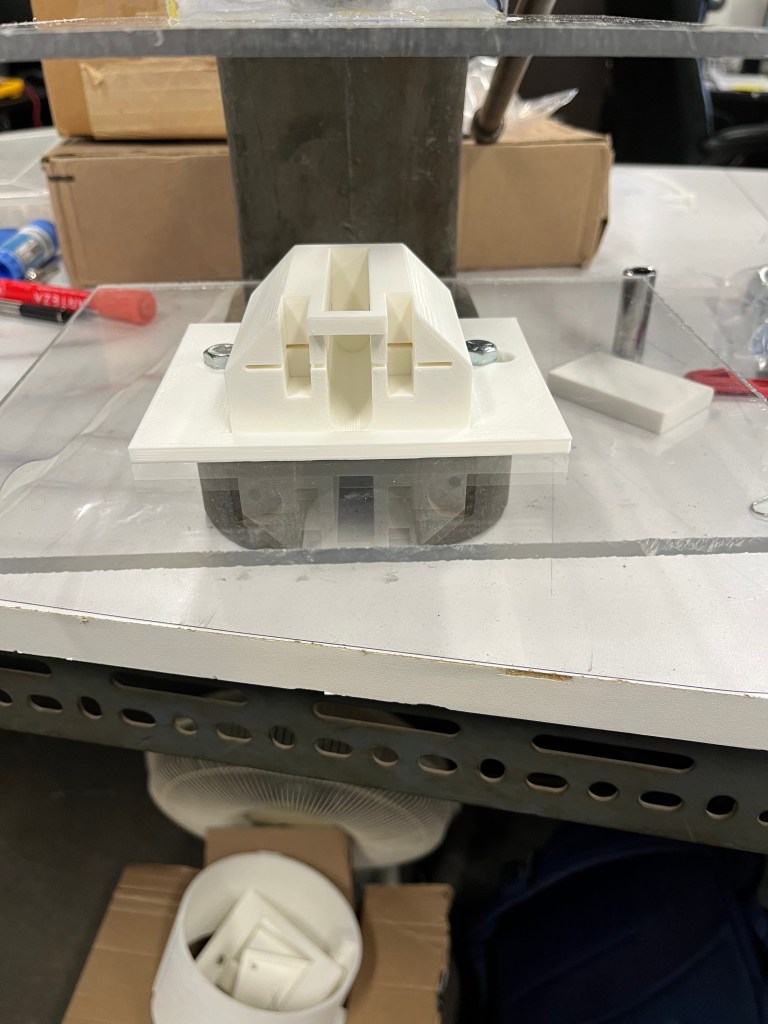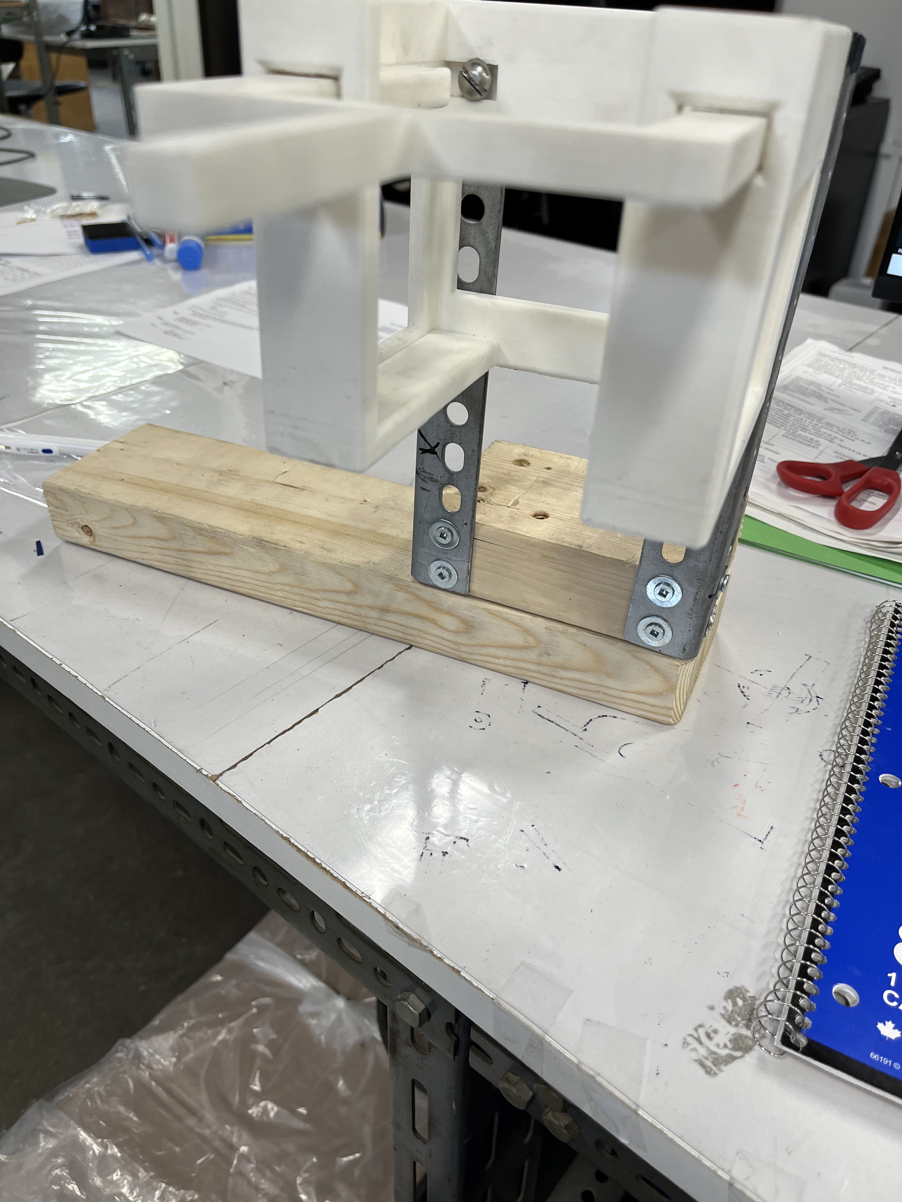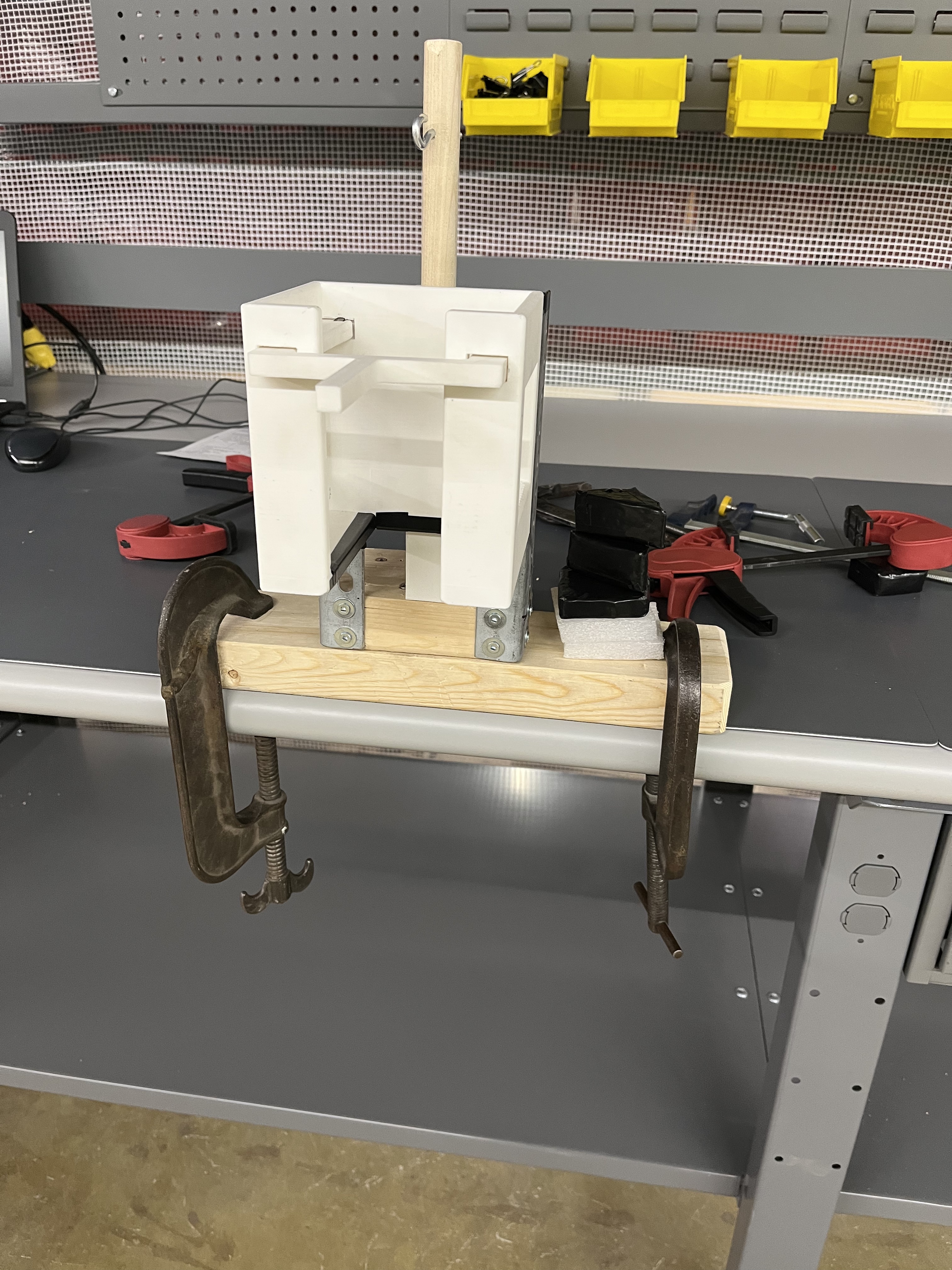 Initial iterations faced challenges with the telescopic holder and sliding fork height. To address this, I redesigned and reprinted the main body to fit size requirements. Additionally, since multiple part sizes needed to be accommodated, I implemented adjustable levelers to modify the box height for a secure fit. The main components, including the box, telescopic holder, and levelers, were 3D printed from PLA, while the holder shaft was crafted from scrap wood. Other structural elements were machined from repurposed materials.