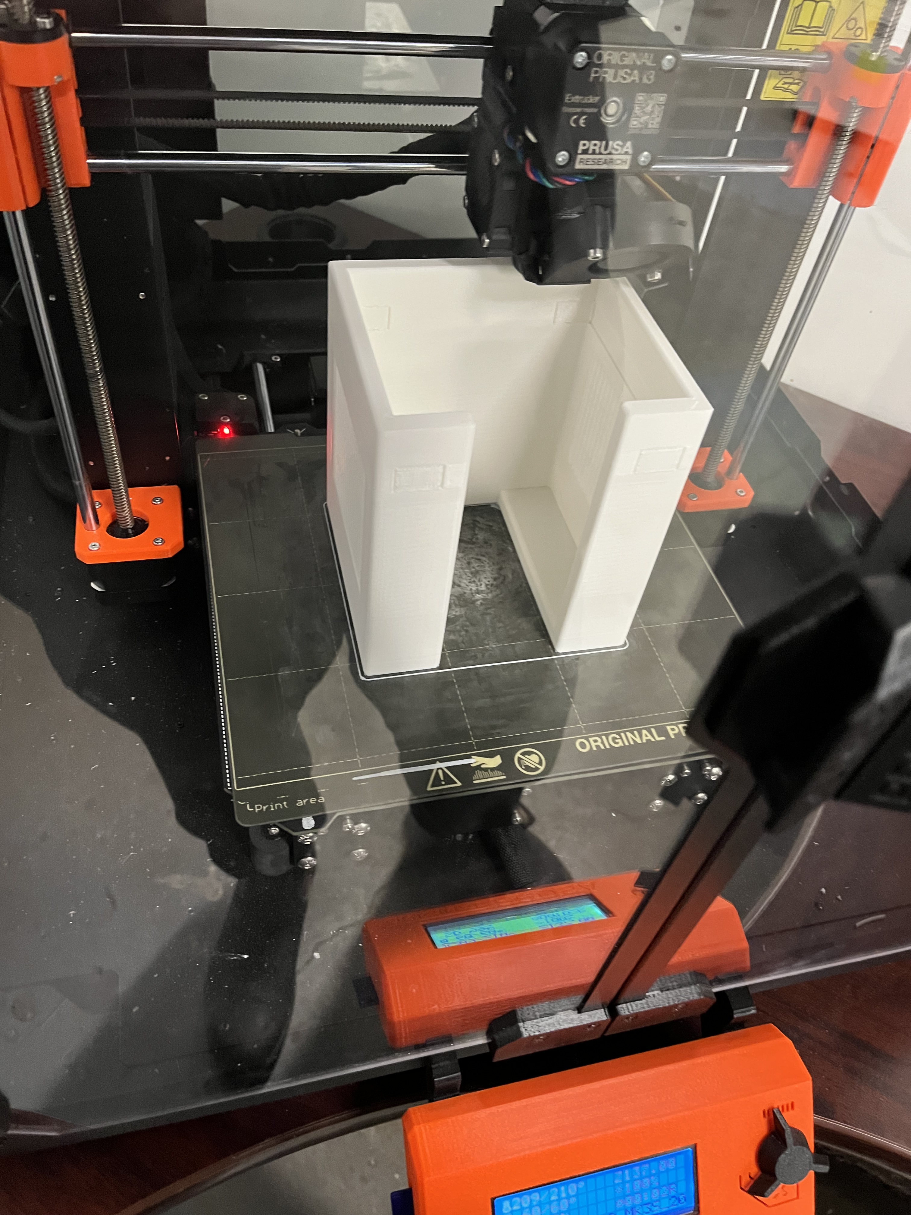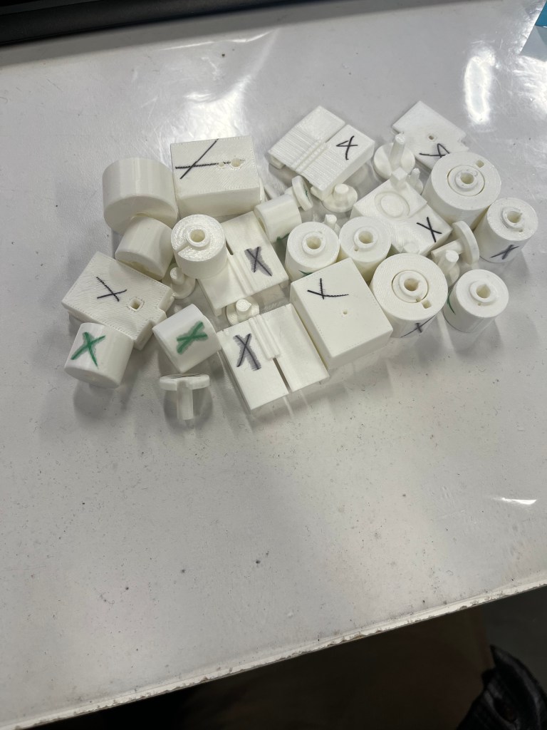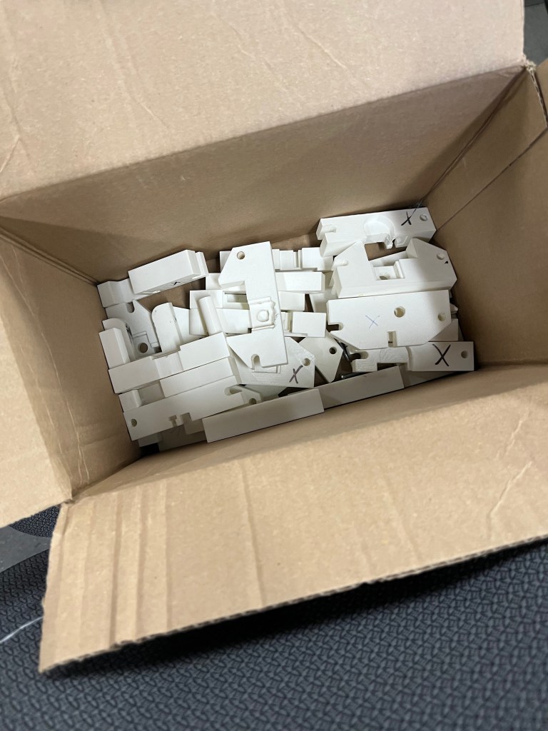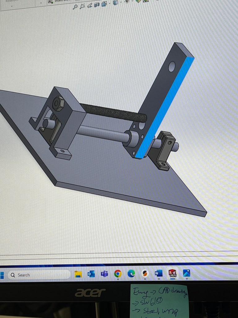Initial iterations faced challenges with the telescopic holder and sliding fork height. To address this, I redesigned and reprinted the main body to fit size requirements. Additionally, since multiple part sizes needed to be accommodated, I implemented adjustable levelers to modify the box height for a secure fit. The main components, including the box, telescopic holder, and levelers, were 3D printed from PLA, while the holder shaft was crafted from scrap wood. Other structural elements were machined from repurposed materials.
