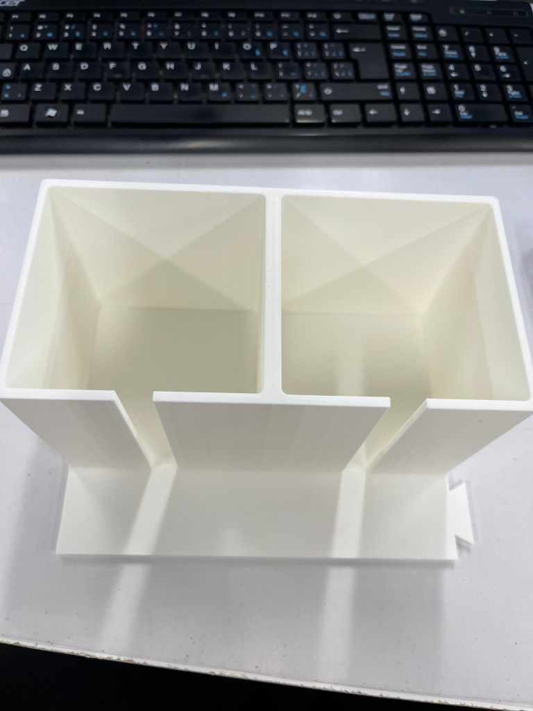 After some brainstorming, I designed a jar holder with a wide base that securely fits the cups and helps keep everything stable. I 3D printed the holder using PLA, but since the printer’s build plate wasn’t large enough for all three cups in one piece, I split the design into a one-cup and a two-cup section. They connect using a puzzle-style joint, so they stay firmly together when in use.