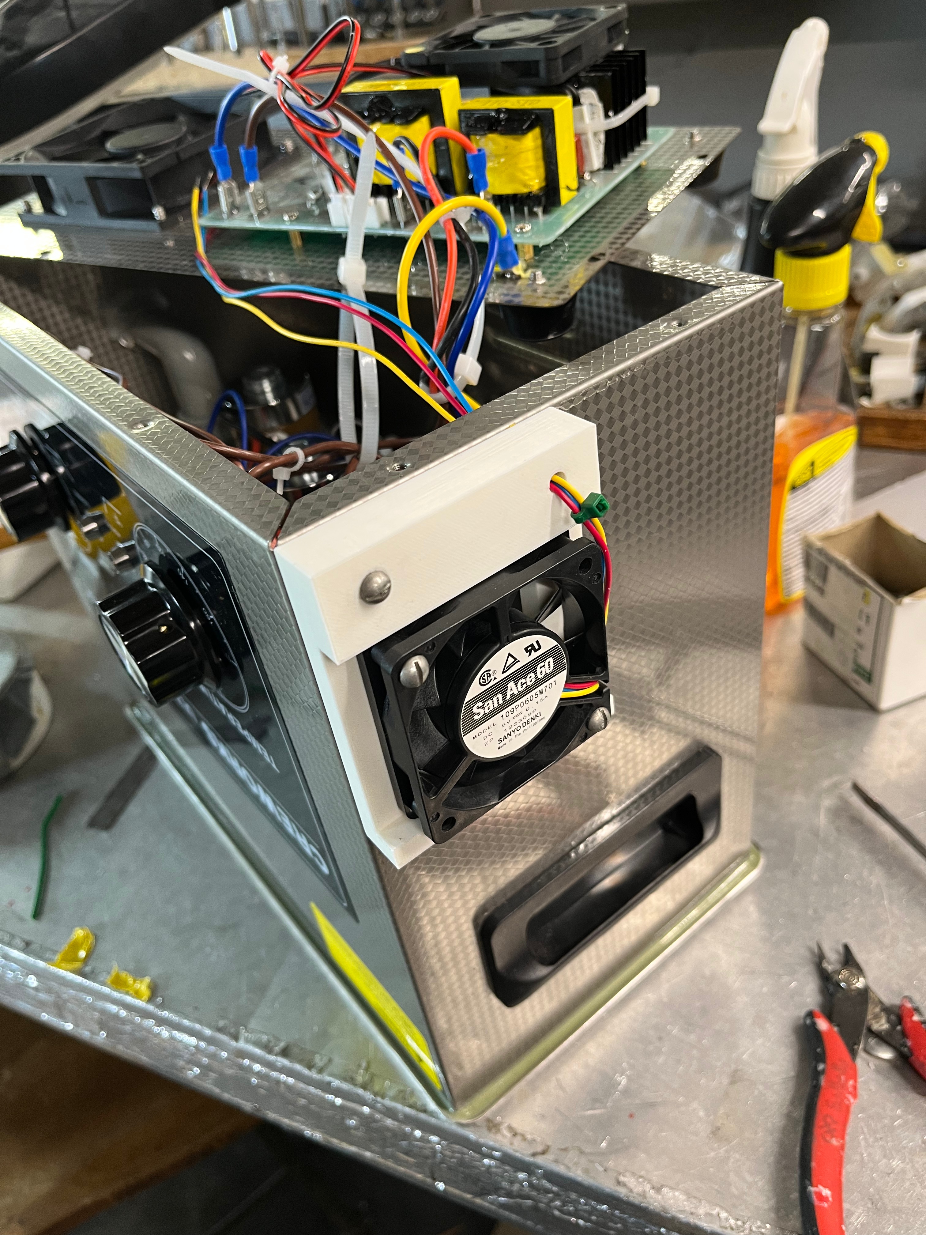 To install the system, I drilled into the stainless steel frame and designed a custom mounting bracket to securely hold the fan in place. The bracket was 3D printed to fit the machine’s dimensions precisely and ensure long-term stability under operational conditions.